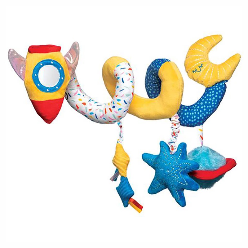 Spiral features space-themed fun from end-to-end, featuring a rocket with baby-safe mirror and crescent moon. Three dangling attachments include a crinkle star with a flexible elastic cord, stars with textured fabrics and ribbons, and a furry planet rattle