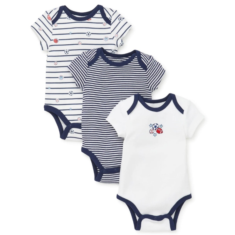 - Give your little cutie three different looks with this three pack bodysuit assortment. Made from soft cotton, they are both durable and gentle against Baby’s skin. Assortment includes dot print with rose applique, solid pink with bow and allover rose print. Lap shoulders and bottom snaps make dressing and changing a breeze.
