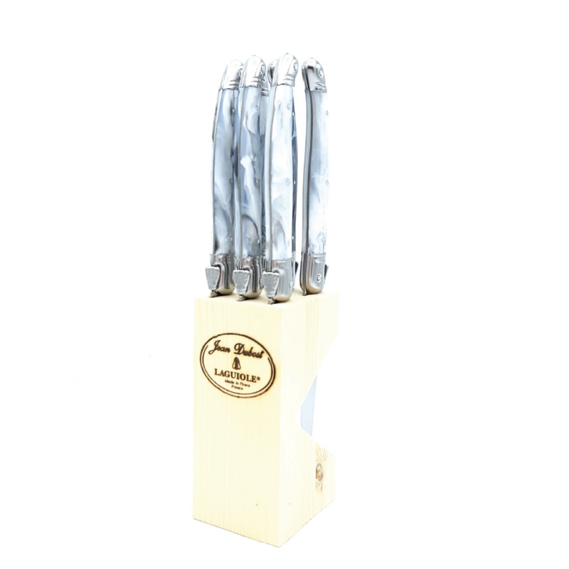 The Jean Dubost family has crafted renowned, high-quality artisan knives since 1920. Trusted in kitchens and restaurants throughout France, the legendary Laguiole tradition has now gone global. TheLaguiole mark has expanded to include flatware, wine waiters, and cutlery crafted with the same quality and craftsmanship. Mmmm…le biftek! The Steak Knives In Marble Block, Set of 6feature handles in marble tone to provide just the right amount of character to your table, but included here is a knife block, for the easiest of storage. Keep your steak knives in displayed in the dining room, or neatly tucked away. Either way, there’s no better way to cut into the finest of meats.