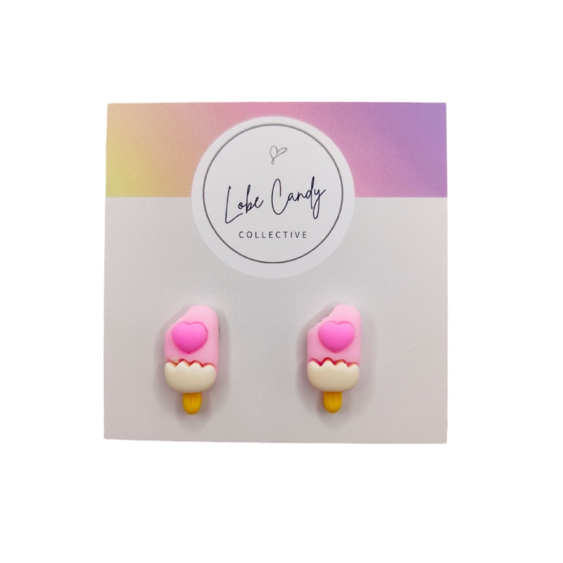 Pink paddle pop with heart – From our Kawaii ice-cream collection, lightweight, cute, really cute! Hand assembled, suitable for most sensitive ears using stainless backings and butterfly clips.