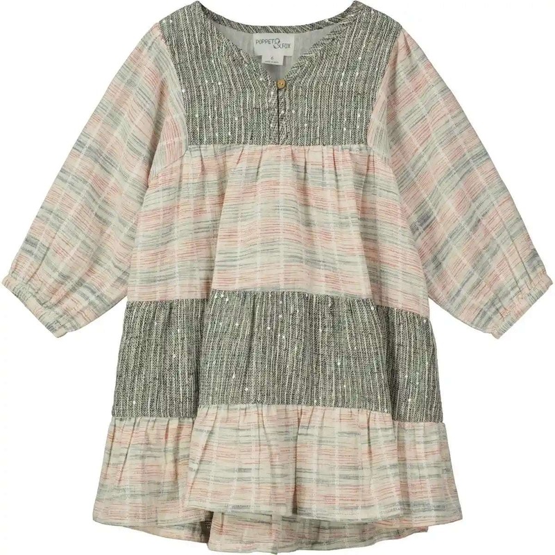 Contrasting tiers mix softly woven raspberry and charcoal fabric with lightly sequinned material. With buttons on the placket, this fully lined dress is practical and beautiful.