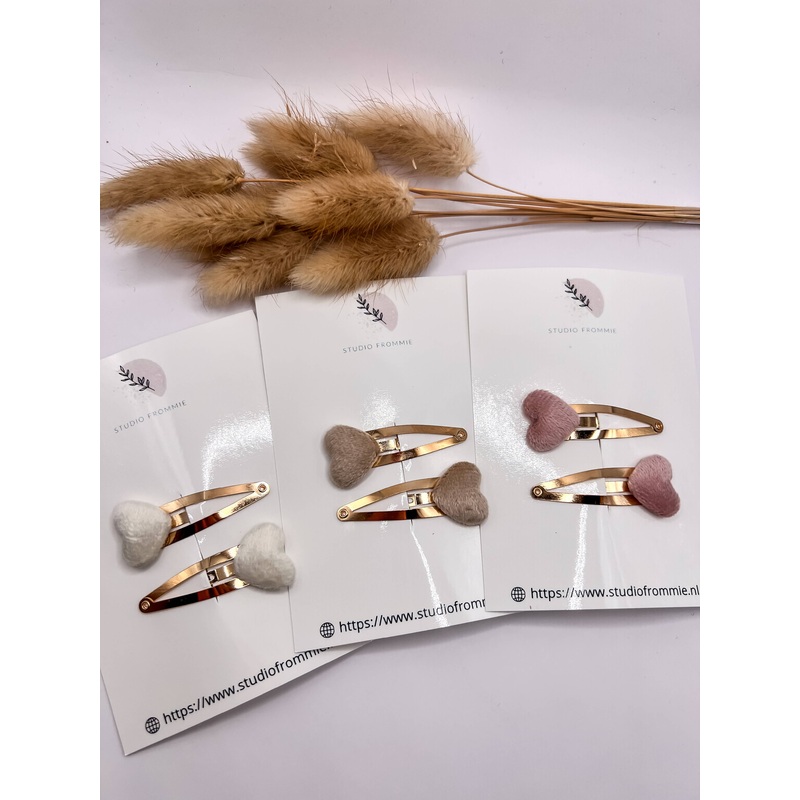 A nice set of 2 sweet click clips.. The hearts are attached to a 4 cm gold pin. This makes them suitable for 0/4 years of age.Pick your favorite color! White, beige or soft pink