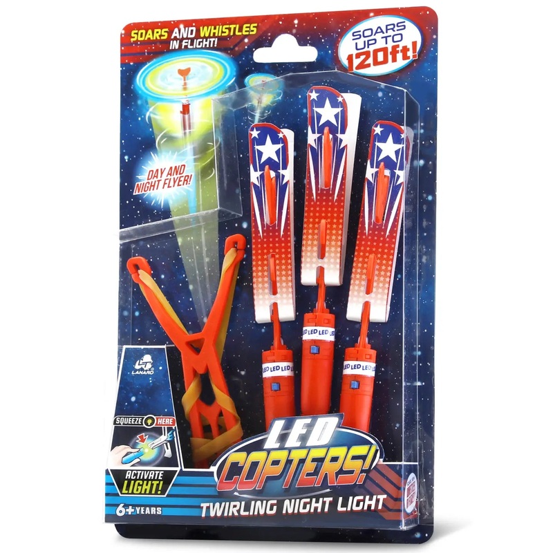 Sling shot these light up copters into the air to create a whistling sound and dazzling glow