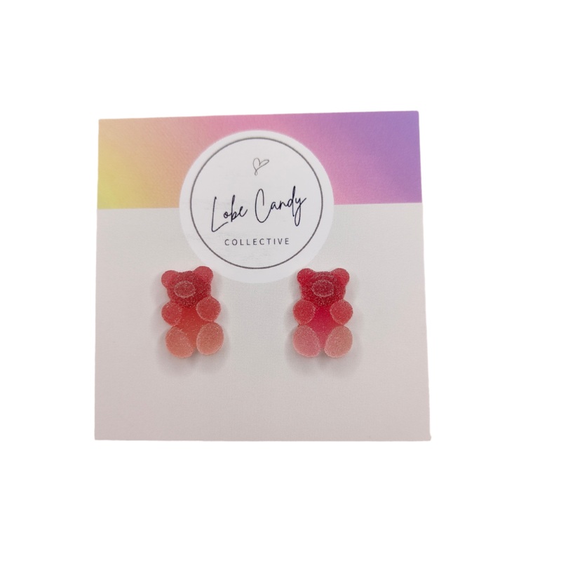 Suga gummies are sweet and perfect in size for any lobe, they have a slightly rough texture to them. Hand assembled and suitable for most sensitive ears using stainless backings and butterfly clips.