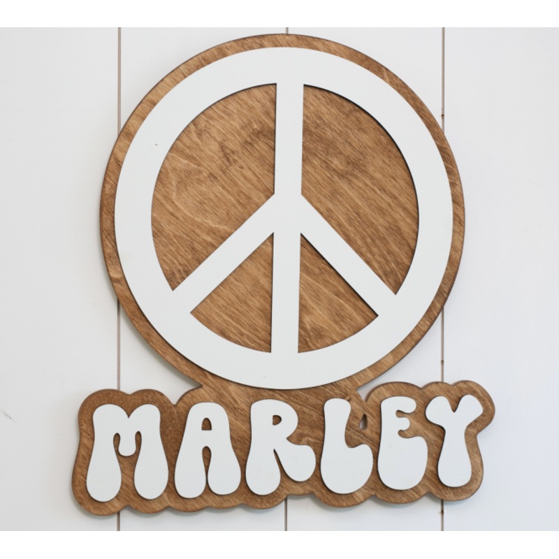 It's all peace, love, and joy with this charming custom round peace sign! Your unique name to complete your artistic vision for your little ones room.MEASUREMENTS24" diameterBackground 1/2" thickLetters 1/4" thickHANGINGComes with a separate sawtooth hange