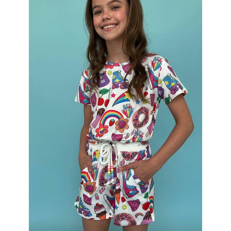 Description:The Summertime Fun Set features a colorful print full of playful summer icons.Includes a knotted crop top and drawstring shorts for a breezy, casual fit.Perfect for warm-weather adventures with its vibrant, fun-loving design.Material & Care:Fab