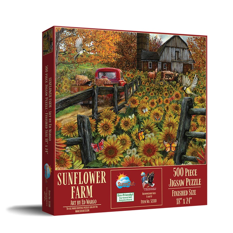 This Bass Harbor Light Station 500 PC Puzzle 28545 can provide hours of fun for you and your loved ones as you assemble this beautiful scene. It features a field full of sunflowers and a variety of butterflies and a red truck driving up the road towards a old barn.