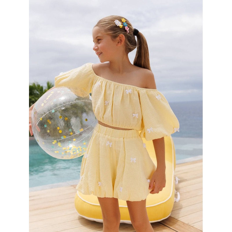 • A cheerful pastel yellow set designed for sunny daysfeatures a puff-sleeve crop top and matching bubble shorts.