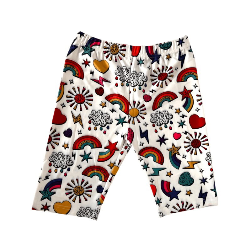 • Brighten up your wardrobe with these shorts, adorned with playful rainbows, stars, and lightning bolts.