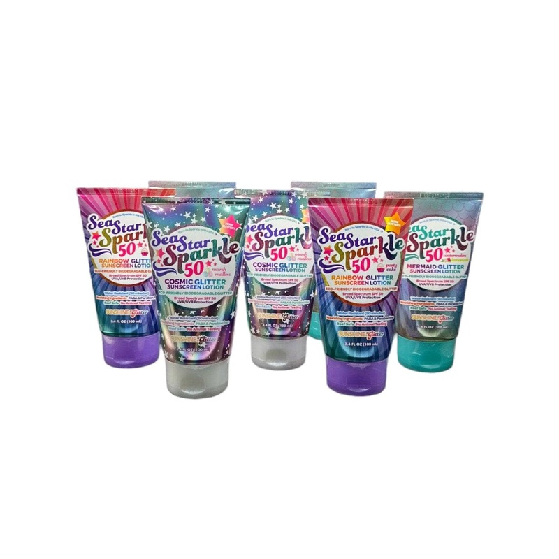 Description:Fun and effective SPF 50 sunscreen lotion infused with dazzling glitter for a touch of sparkle.Provides broad-spectrum UVA/UVB protection while leaving skin shimmering with a cosmic or rainbow glow.Water-resistant formula perfect for pool days,