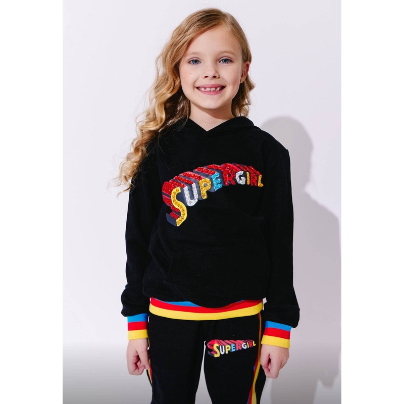 Description:Stylish Supergirl Rainbow Stripe Set features a vibrant "Supergirl" print with rainbow stripe accents.Hoodie features ribbed cuffs and hem with colorful stripes for a trendy look.Jogger pants have an elastic waistband and matching rainbow strip