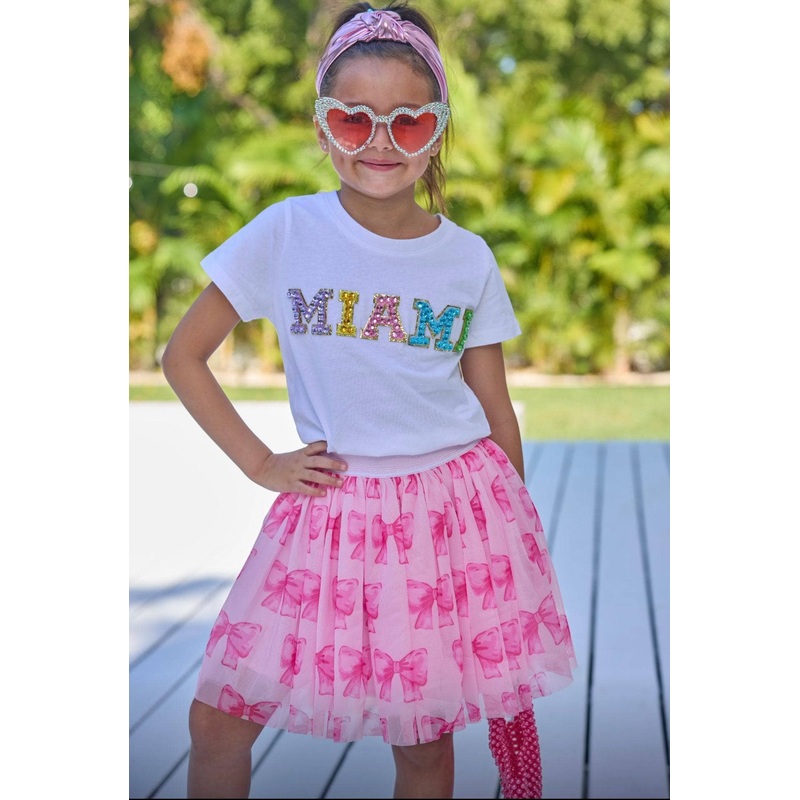• Adorable pink skirt adorned with a playful bow pattern, perfect for adding a touch of sweetness to any outfit.
