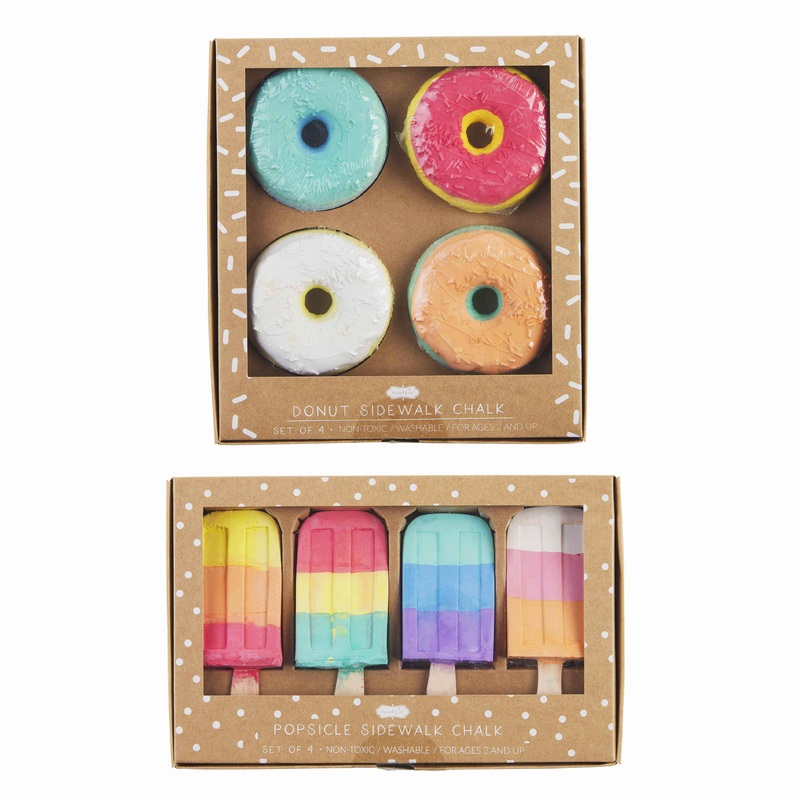 Entertain littles outside with our cleverly designed Sweet Treat Chalk Sets. The set comes with four shaped washable sidewalk chalk. This chalk set is sized perfectly for little hands. The chalk set is intended for children ages 3 and older. The set arrives in a fun gift box.