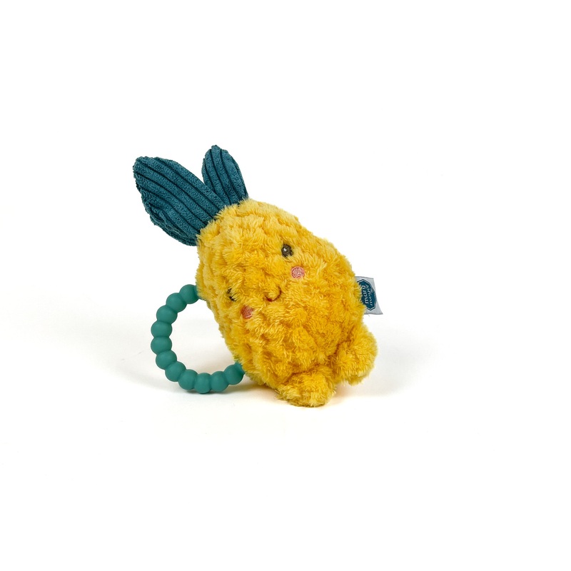 Smiles all around withthis cheerful little pineapple! It measure 6 inches tall and features a soft, fuzzy body with softembroidered eyes and corduroy-like leaves. The silicone teether will sooth sore gums.