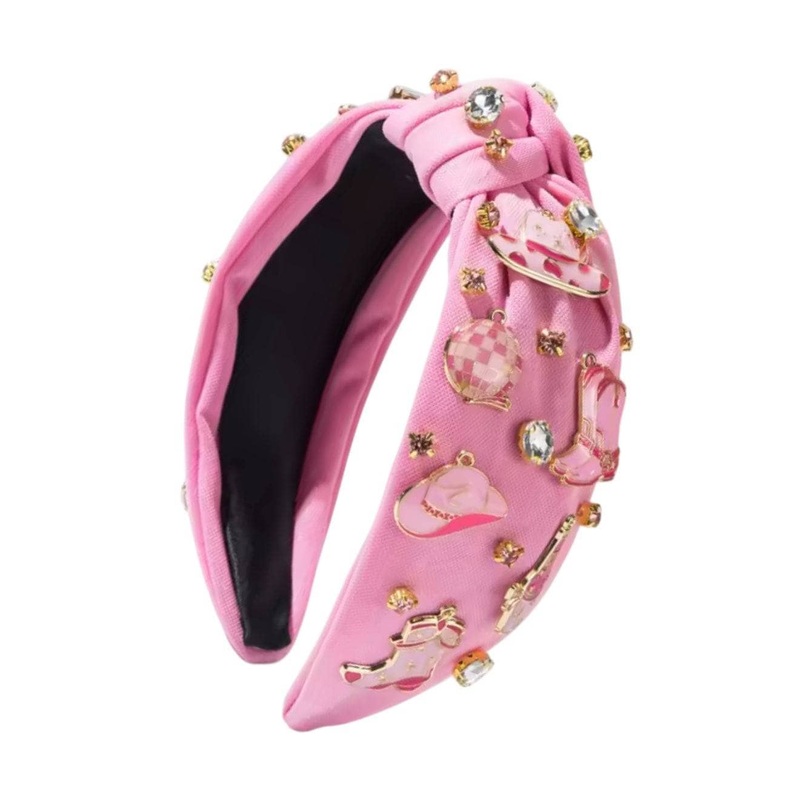 - Pink structured headband adorned with sparkling crystals and metallic enamel Swiftie-themed charms.
