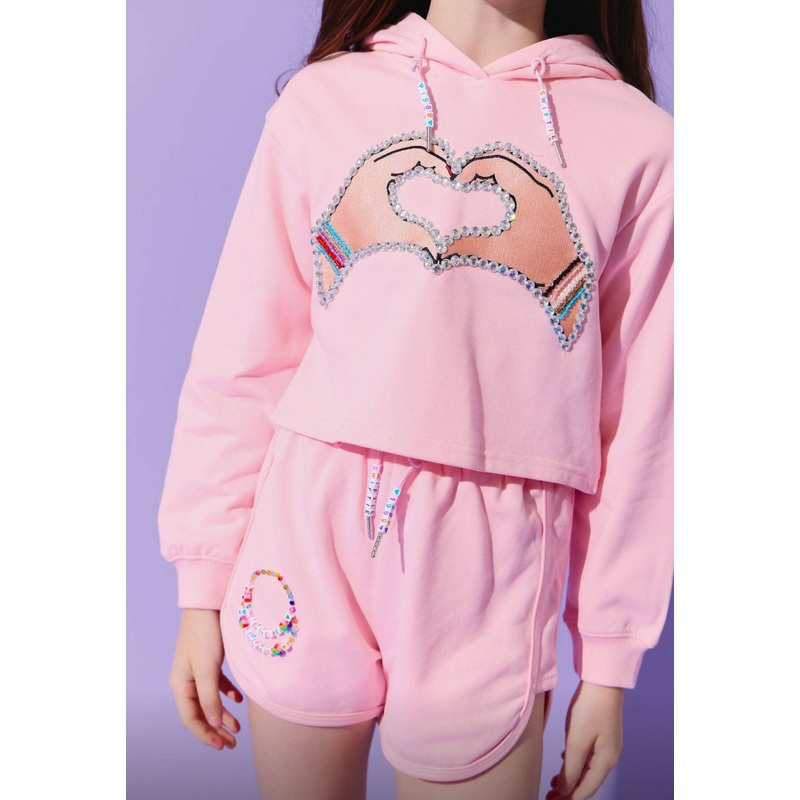 • Features a cropped hoodie with a rhinestone hand-heart design for extra sparkle.