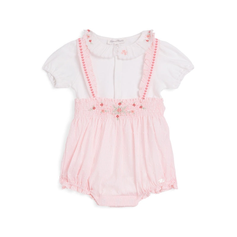 tartine et chocolat adorable 2-piece set for your little one. light pink and cream striped salopette with cute cross-over back and embroidered rosette details. matched with a white bodysuit featuring a ruffled collar and delicate floral embroidery. easy pr