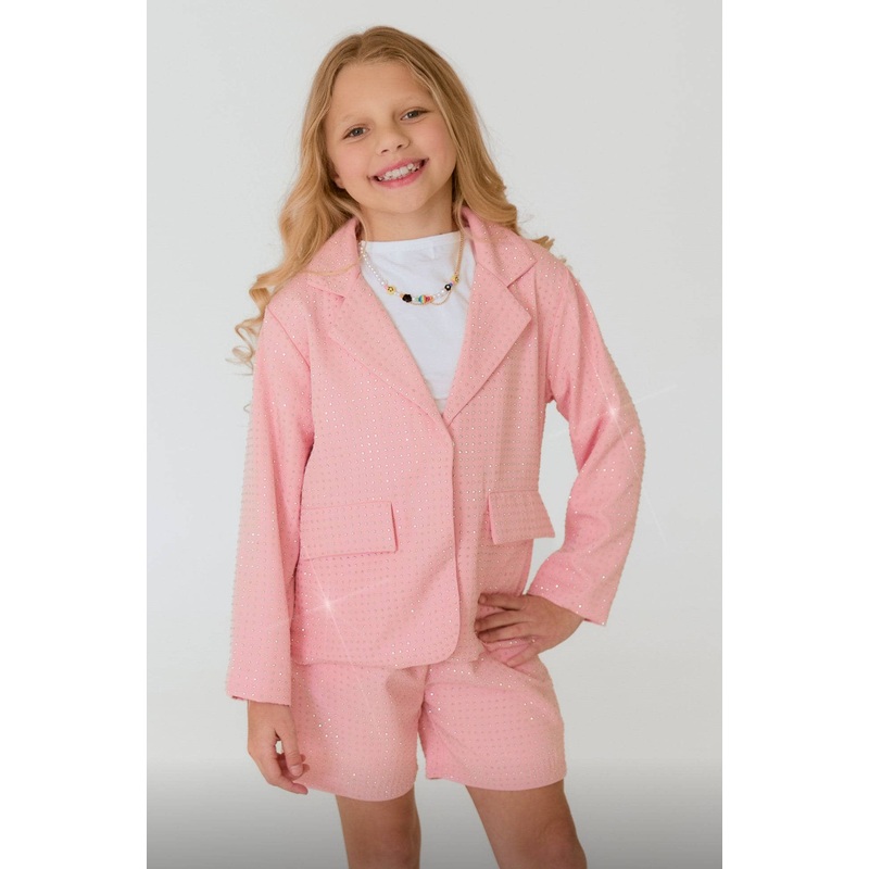 Description:Sparkle with confidence in this chic pink suit adorned with shimmering crystal embellishments.Includes a tailored blazer with notched lapels and front flap pockets, paired with coordinating high-waisted shorts for a polished look.A versatile se