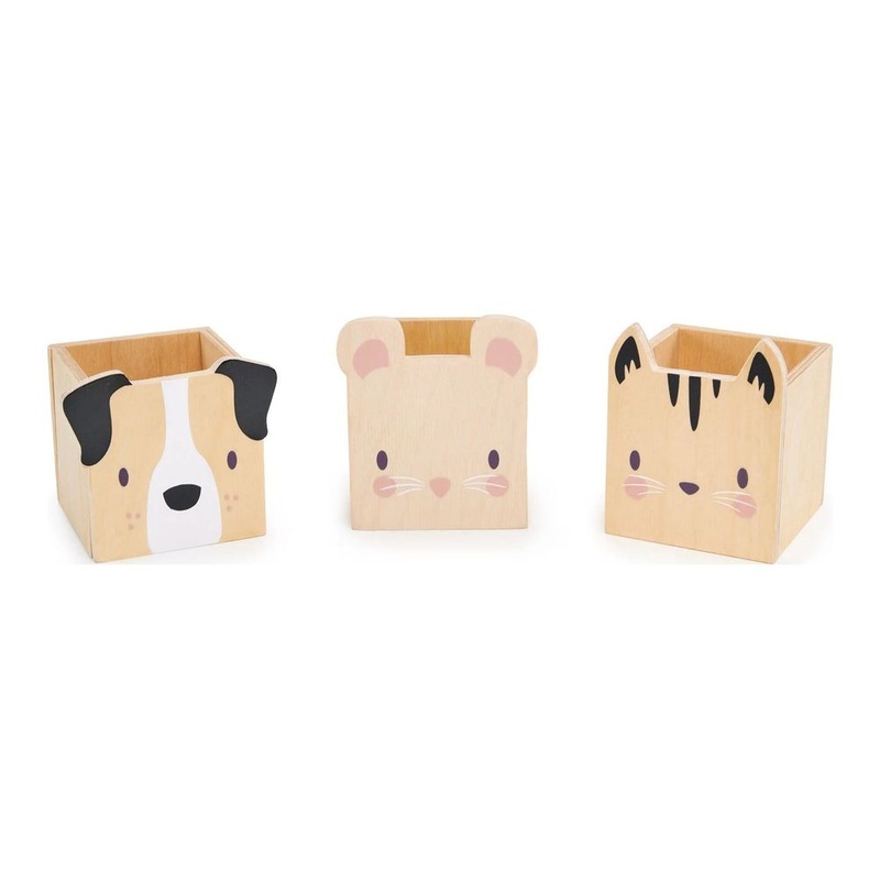 A set of wooden pencil pots to use as organizers for your child creative or work space. Illustrated with a friendly Cat, Dog and Mouse faces. Great along side our Desk and Chair, and a lovely characteristic addition to the nursery.