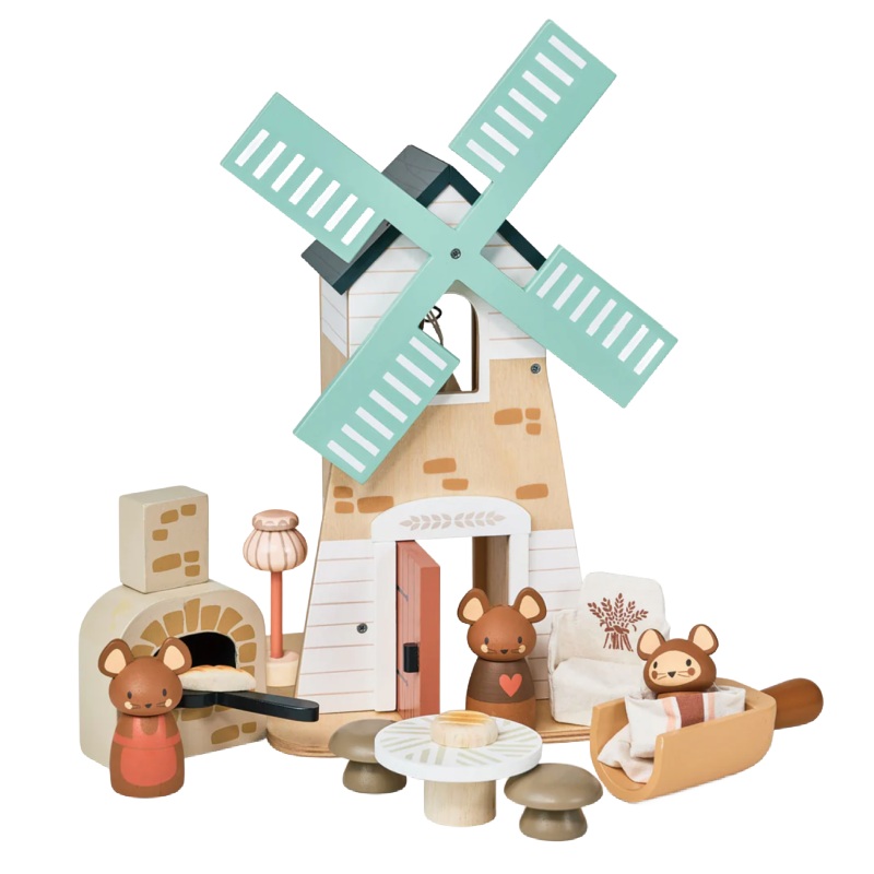 tender leaf toys penny windmill. part of the merrywood tales range, these three little wooden toy field mice have made a perfect home in a wheat field. the windmill is two stories tall and has a revolving windmill which when it turns, raises a small bag up to the second story. accessories include: a bread oven, two loaves of bread, a bread shovel, table and two stools, a grain sack, a fabric armchair, a lamp and a flour scoop that doubles up as a bed for the baby mouse. a wonderful toy for story telling and imaginative play with children.