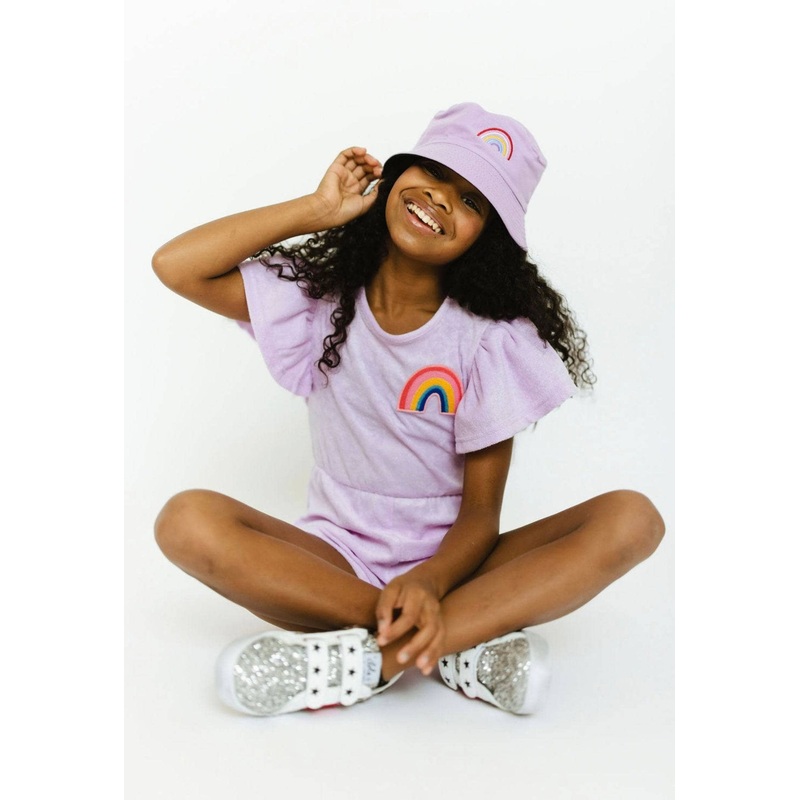 - Adorable lavender romper crafted from soft terry fabric, featuring flutter sleeves and a vibrant embroidered rainbow patch.