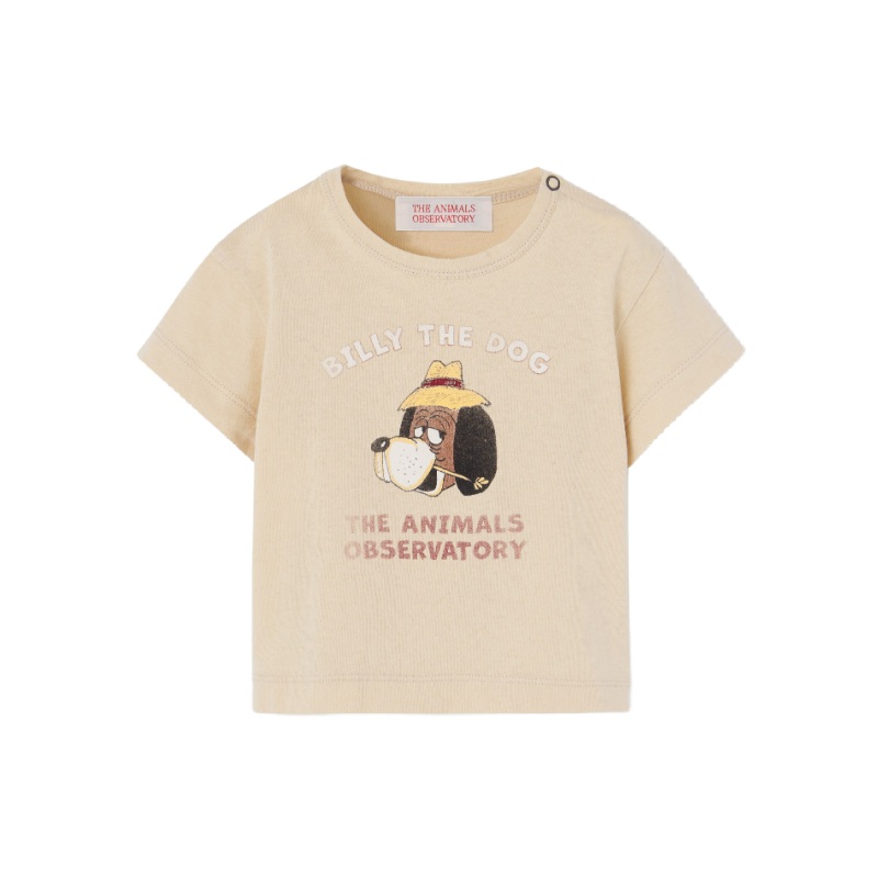 the animals observatory rooster baby t-shirt in beige. features a billy the dog graphicon the front and a round neck with buttons at the shoulder for easy dressing.100% organic cottonmade in portugalfinal sale