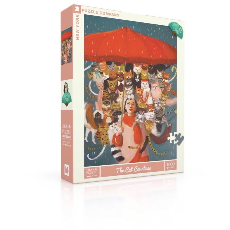 These cats won’t let a few raindrops spoil their day as they take a trip outside with Miss Mink neatly under her umbrella.