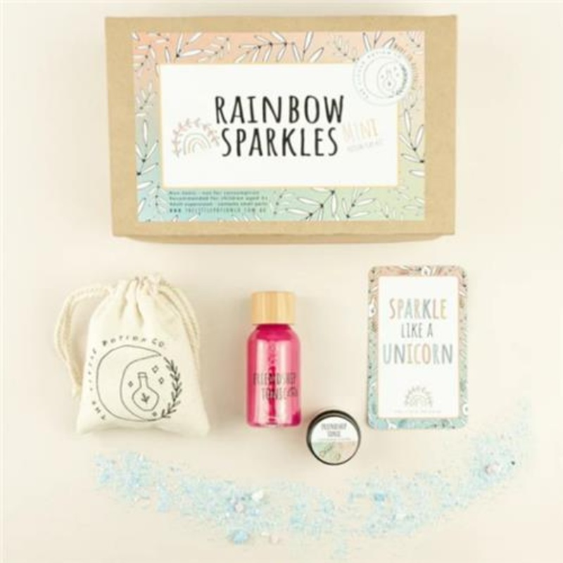 The Little Potion Co. MINI Rainbow Sparkles Potion Kit.SPARKLE LIKE A UNICORNThis Sparkly mini kit is for those who dream of meeting a unicorn and wish on rainbows. Create potions for Love, friendship and hope with this kit.Our Mini kits are the perfect in