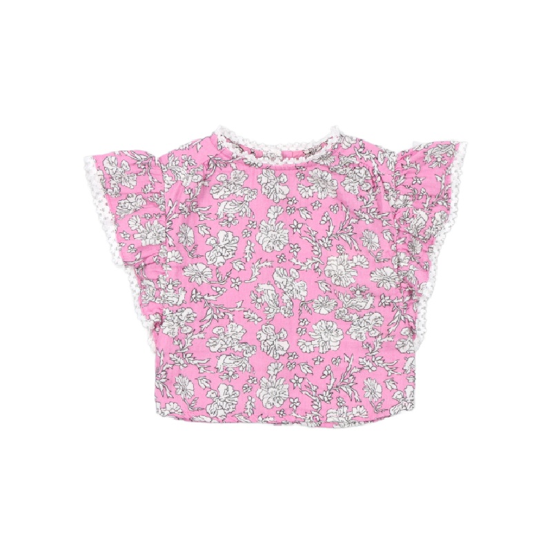 the new society melina baby blouse in peony hibiscus print is a pink top trimmed with ruffles and white rick-rack. this top buttons up the back for easy dressing.