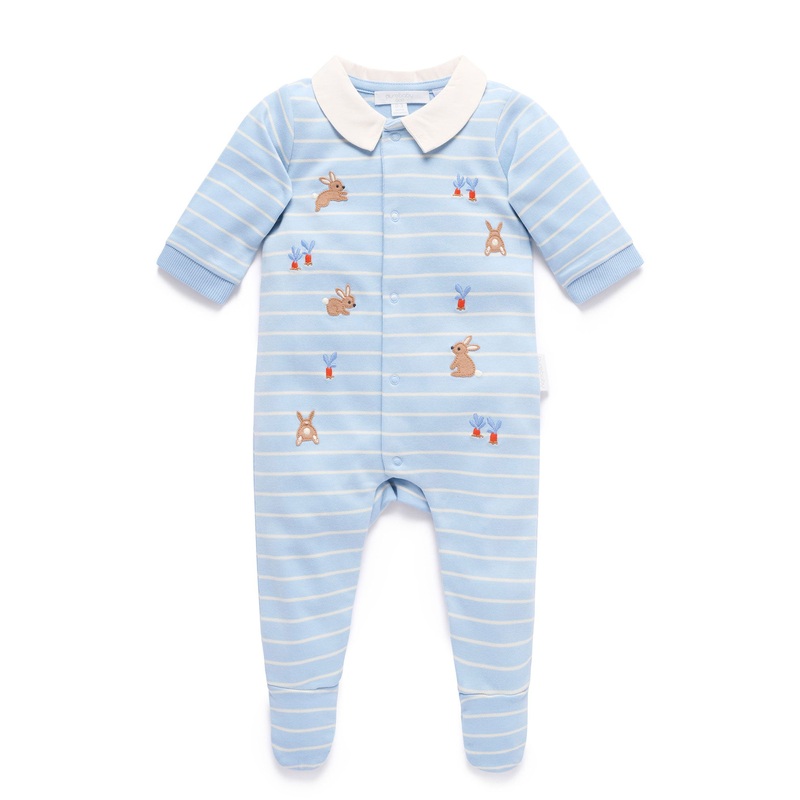 Our Thick Peekaboo Bunny Growsuit is a sweet, classic style! Featuring a fun bunny and carrot applique, with a structured collar and snap clips down the body for easy changing. Made from a thick 100% Organic Cotton interlock to keep your little one warm in the cooler months. Snap clips down the body and leg Bunny and carrot applique Thick cotton interlock Ribbed cuffs to keep out chills Inbuilt feet for warmth Made from 100% Organic Cotton
