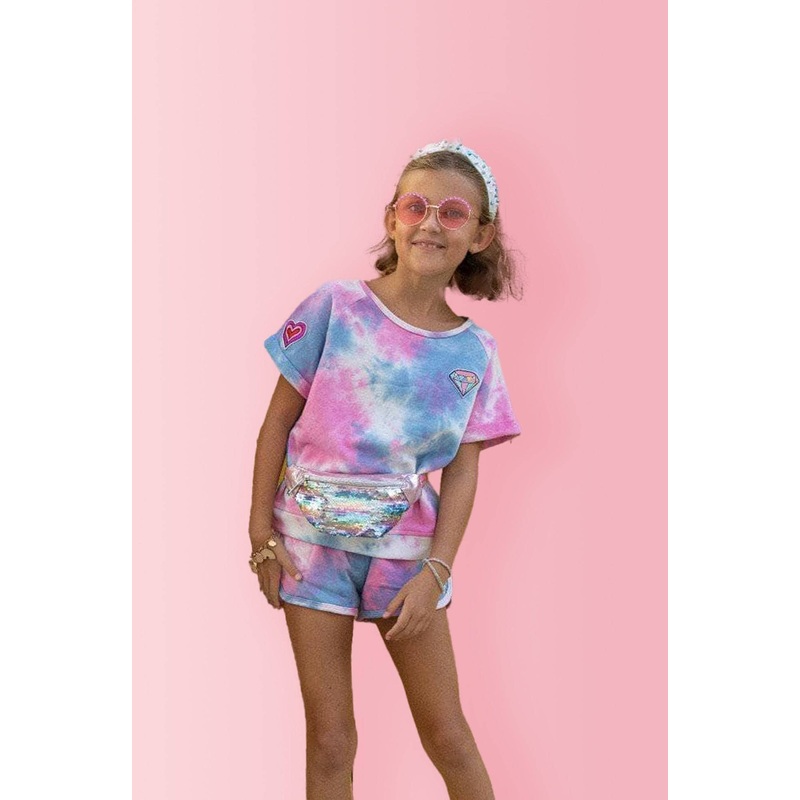 - Fun and colorful tie-dye short set with playful patch details for a trendy look.
