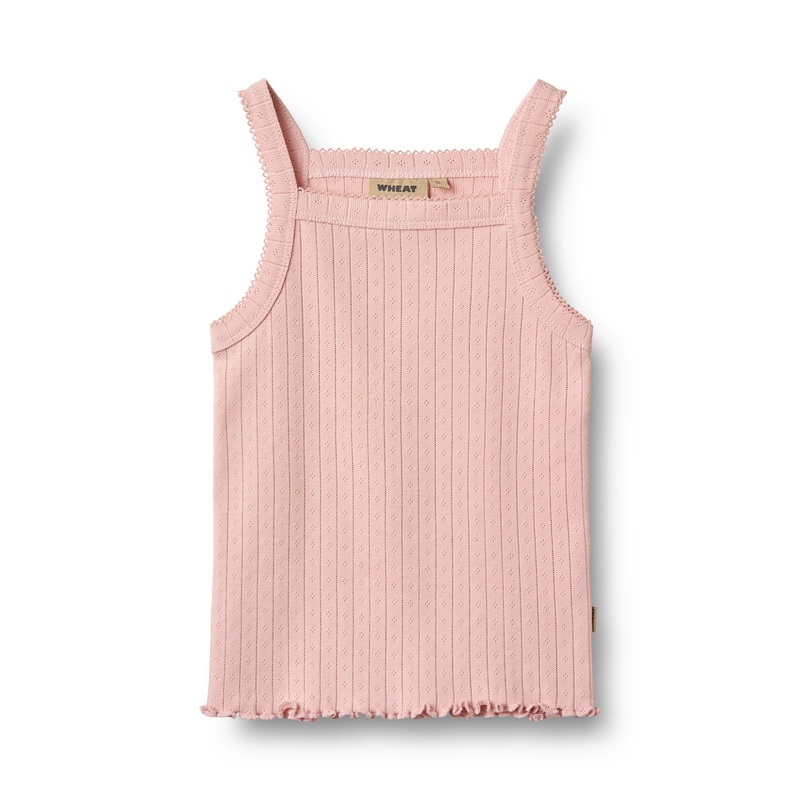 Tank top with frill details in organic cotton for children. - Fitted and stretchable - Ribbed structure with pointelle pattern - Picoting/lace details at neckline and armholes - Overlocked edges at the bottom hem Wheat's tops are a wardrobe staple during t