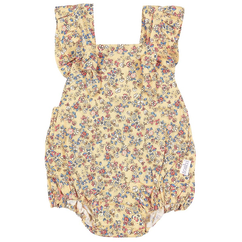 The Toshi Baby Romper is reminiscent of bygone days and is the perfect look for a fun summer occasion. Flattering frills create a pretty, feminine style and the open back is light and playful. The romper has shoulder ties for adjustable sizing and convenient dressing. Elasticised waistband and leg openings offer greater flexibility for a snug fit. Press studs create convenient nappy changes. Romper Libby Sunny features a delicate and petite vintage inspired floral design in a spring yellow colourway.