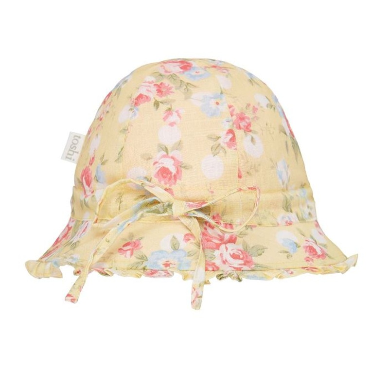 Toshi Bell Hat Pretty is a flattering and feminine bell shape hat. The baby sunhat offers a head tie for adjustable sizing and a chin tie secures the hat. Pretty styling is created with a softly frilled border. A beautiful vintage inspired floral design is