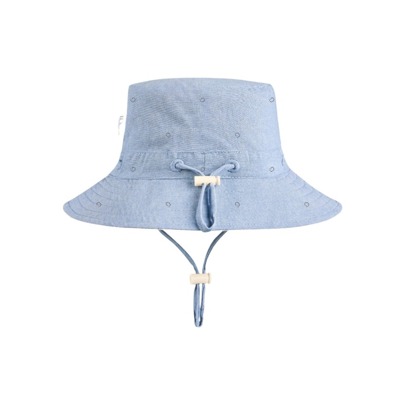 Toshi presents the classic Sunhat Xavier, ideal for children of all ages. The UPF 50+ UV rating indicates maximum sun protection. The Toshi sunhat has a broad and well-structured brim. The head tie creates adjustable sizing and the chin tie with toggle secures the hat for ease of wear. A security release clasp on the chin tie is designed to enhance wearer safety. Sunhat Xavier is crafted from a highly durable cotton chambray fabric. The sunhat is fully lined for additional comfort.