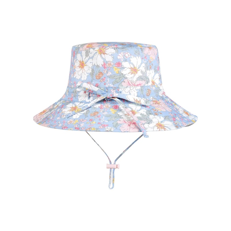 Finest quality 100% cotton Head tie and toggle for adjustable sizingChin tie and toggle to secure hatSecurity release clasp for increased wearer safetyBroad brim for enhanced sun protectionOriginal and exclusive Toshi print designFully lined for increased