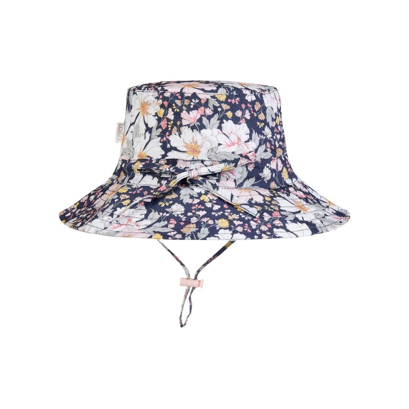 Finest quality 100% cotton Head tie and toggle for adjustable sizingChin tie and toggle to secure hatSecurity release clasp for increased wearer safetyBroad brim for enhanced sun protectionOriginal and exclusive Toshi print designFully lined for increased