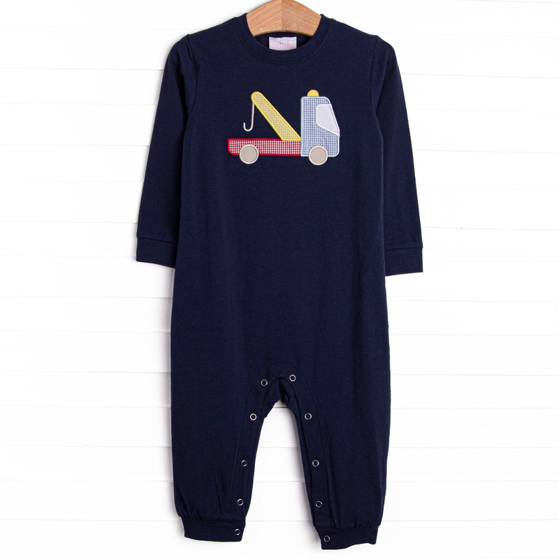 It is Towin’ Time! This romper features navy knit material, snaps on the stride, and a tow truck applique. Your little one will look too cute in this romper!