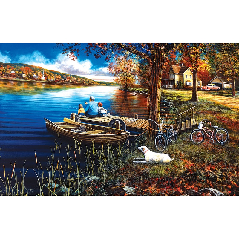 This Treasured Moments puzzle will calm your mind and warm your heart as you piece together the peaceful image. A grandfather and his two grandsons are sitting on a dock overlooking the water and a hilly landscape dotted with autumn shades of orange and ye