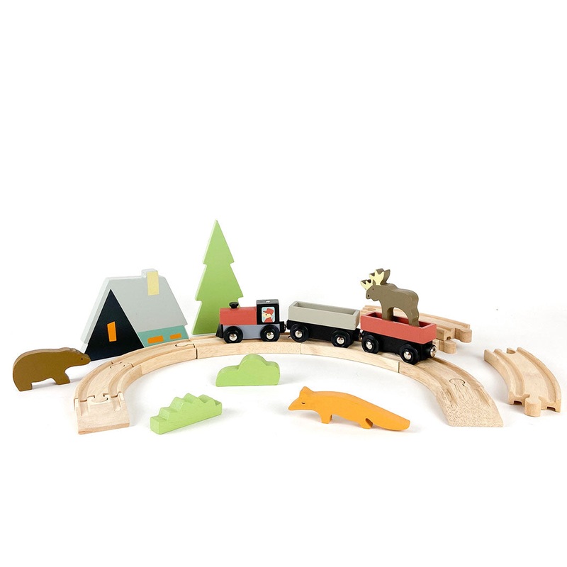 With this sweet train set, your little one can lead their engine on a mountain journey through the trees – perhaps spying a bear, a moose, or a fox along the way. This 22-piece set includes train, tracks, grass, a tree, and a mountain, too.