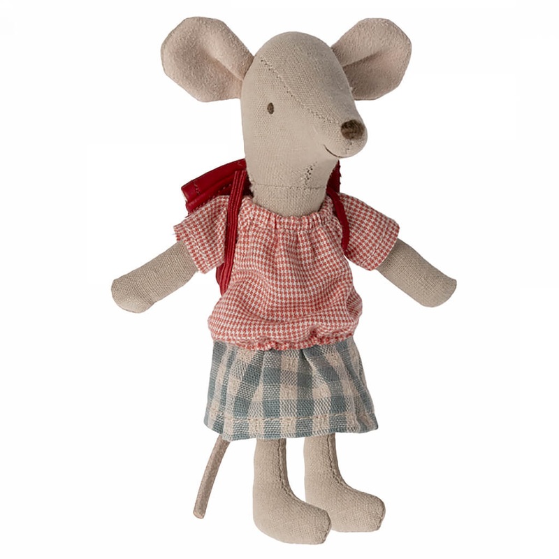 Big sister mouse is ready for a day in school, carrying her backpack on the back. She has magnets in her hands so she can hold the handles of the tricycle for a fast trip.