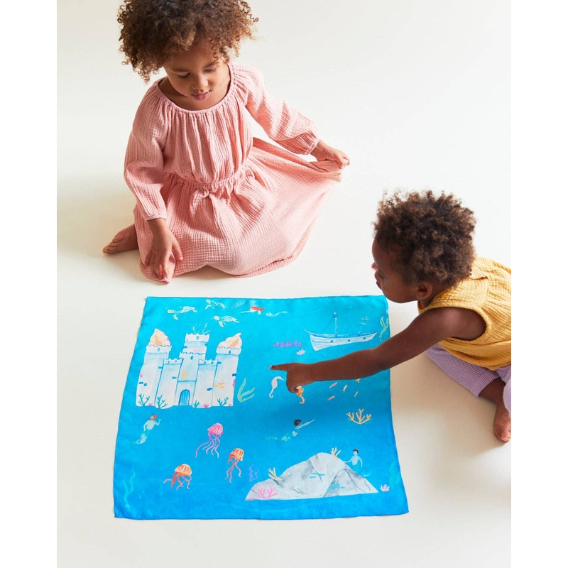 Under the Sea Playmaps are 21×21-inch squares made from gorgeous, heavyweight (8 momme) 100% pure mulberry silk, hand-painted, and then printed with non-toxic, earth-friendly dyes. Featuring a limited edition Mini Playsilk, depicting a fantastical underwater scene featuring merfolk and sea creatures – perfect for small world, imaginative play.