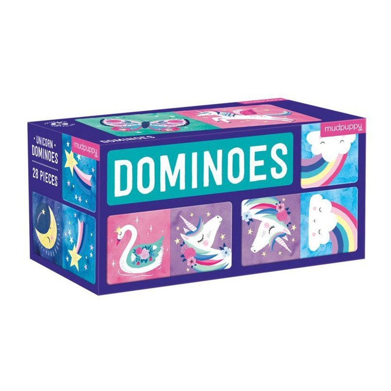 Unicorn Dominoes include 28 oversized double-sided dominoes featuring colorfully illustrated unicorns, swans, rainbows, shooting stars and more on one side and numbered stars on the opposite sidetwo ways to play!