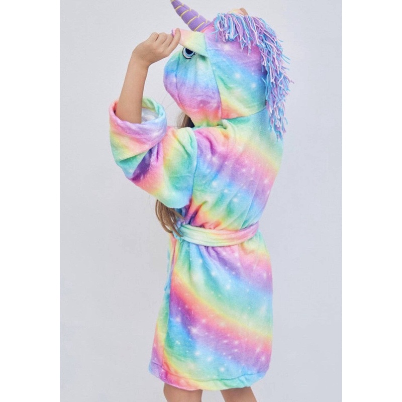 Description:Magical bathrobe featuring a vibrant rainbow design with stars, perfect for unicorn lovers.Adorable hood with a 3D unicorn face, complete with a horn and ears, for a whimsical touch.Made from ultra-soft, plush fabric for ultimate comfort and wa