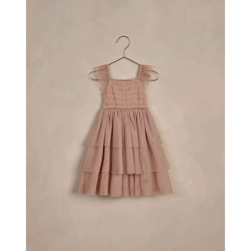 Valentina is a twirly silhouette, featuring a square neckline, full gathered flutter sleeves and tiered layers, and smocked bodice, this tulle dressed in a flocked dot print is made for the most special occasions.