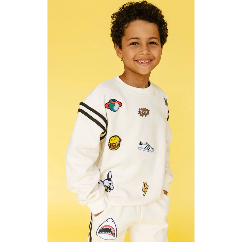 Description:Cream-colored two-piece set featuring bold varsity-inspired patches like burgers, sneakers, lightning bolts, and sharks.Cozy crewneck sweatshirt with sporty contrast stripes on the sleeves.Matching joggers with elastic waist and cuffs for all-d