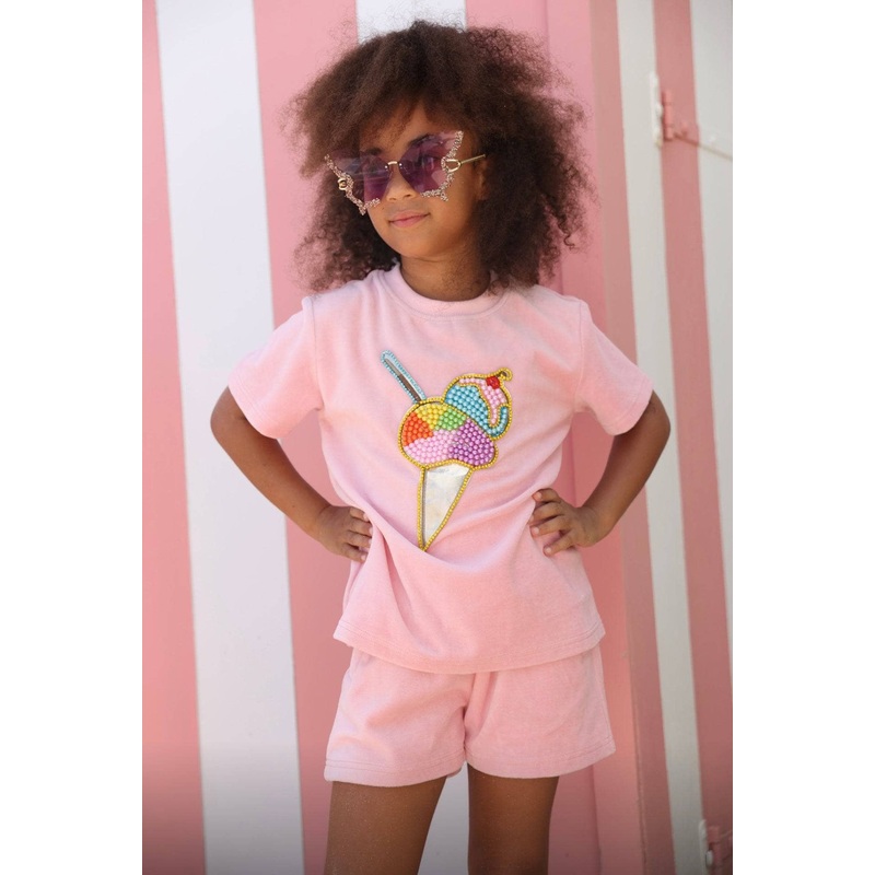 - Adorable pink velour short set featuring a vibrant ice cream cone appliqu adorned with colorful pearls and glitter details.
