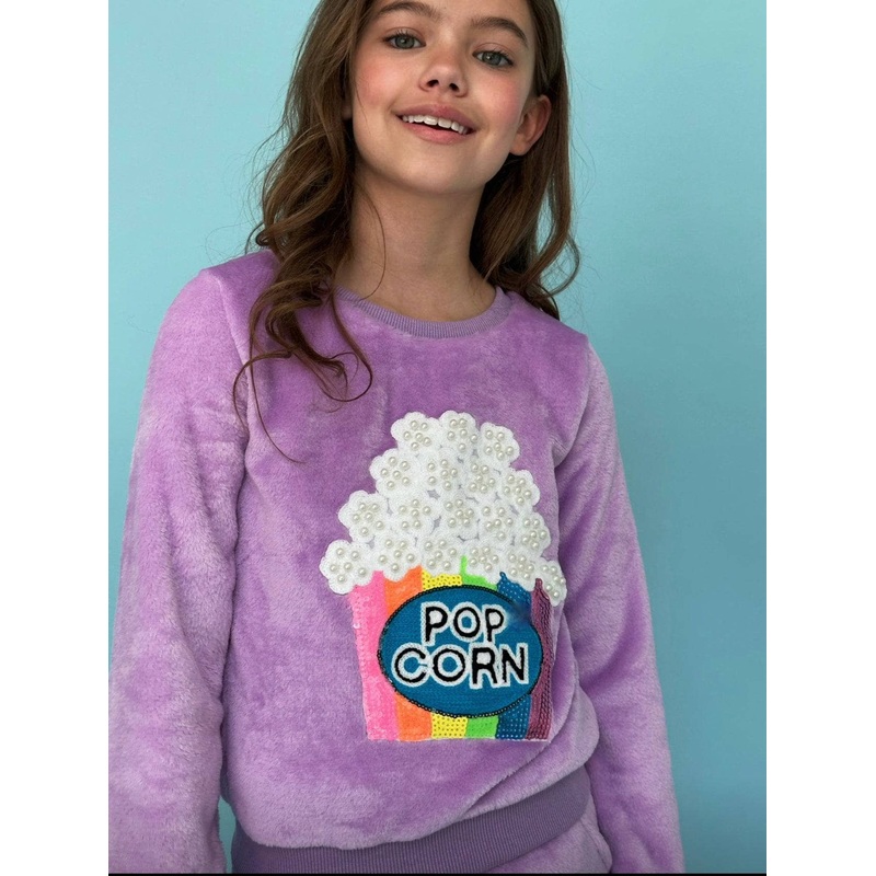- Plush velour set designed with a vibrant popcorn appliqu on the top and rainbow heart accents on the joggers, adding a fun and playful touch.