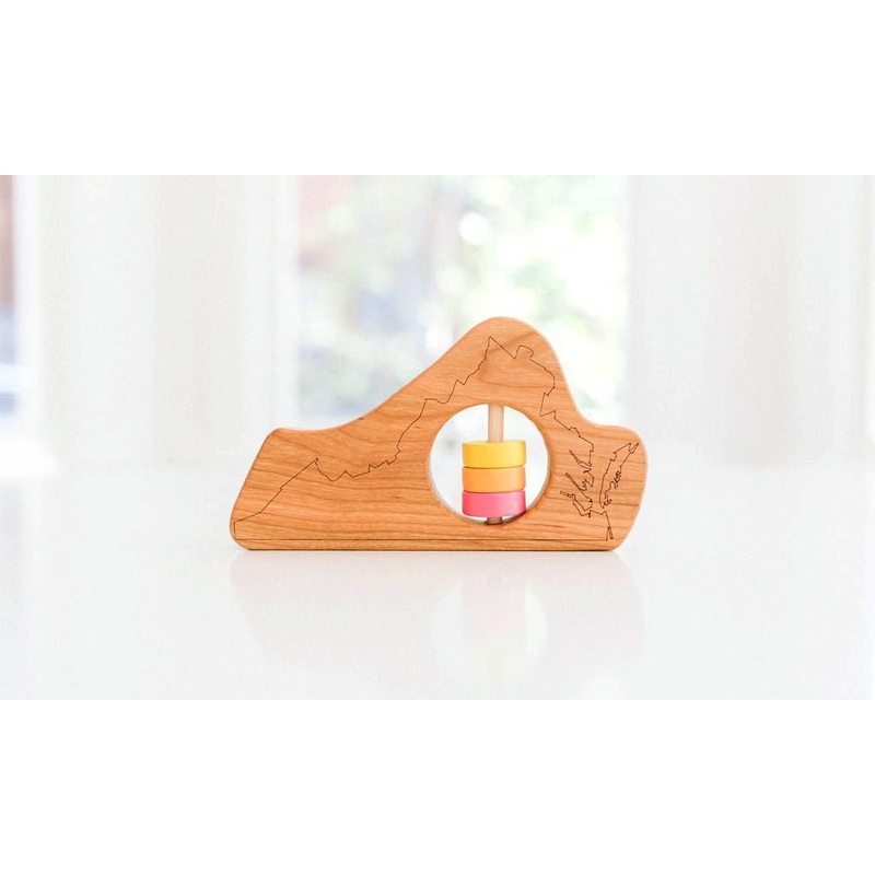 Show your state pride with ourVirginia Stateshaped baby rattle. This rattle is made from solid hardwood Cherry. This baby rattle is 100% organic, made from responsibly harvested woods, and is sure to last long enough to be passed down through several gener