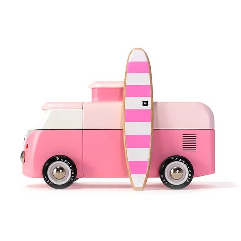 The Beach Bus is back! Now officially licensed by VW – check out the shiny emblem on the front. This iconic Volkswagen Type 2 comes with a magnetic camper top and surf board.